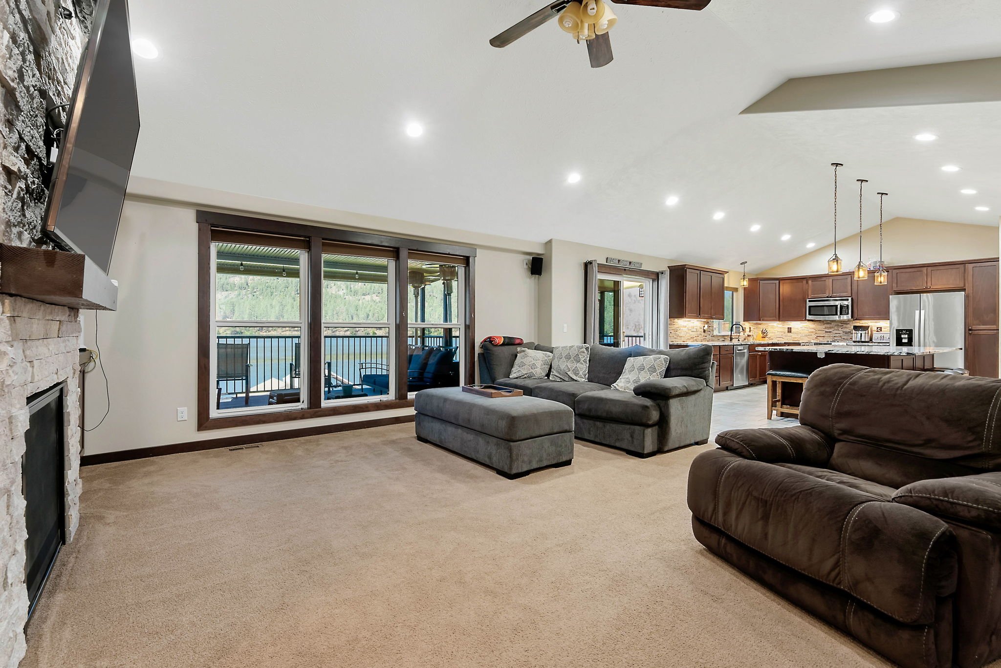 Located between Suncrest and Tum Tum, in Nine Mile Falls this primary waterfront property with 75′ of low bank waterfront is in an excellent location! It has had extensive renovations done including: addition, new roof, new windows, new flooring, new kitchen, baths, etc – the list goes on! A fireplace both upstairs and downstairs with one on the back composite deck for outdoor entertainment! Two storage sheds on the property for all your toys along with a 30′ x 50′ garage with ADU upstairs! In the ADU you will find another 1 bed and 1 bath with its own fireplace. Down below at the water you will have a gazebo and outdoor wood burning fireplace! Easy access to get your boat in and 10′ deep at the dock!