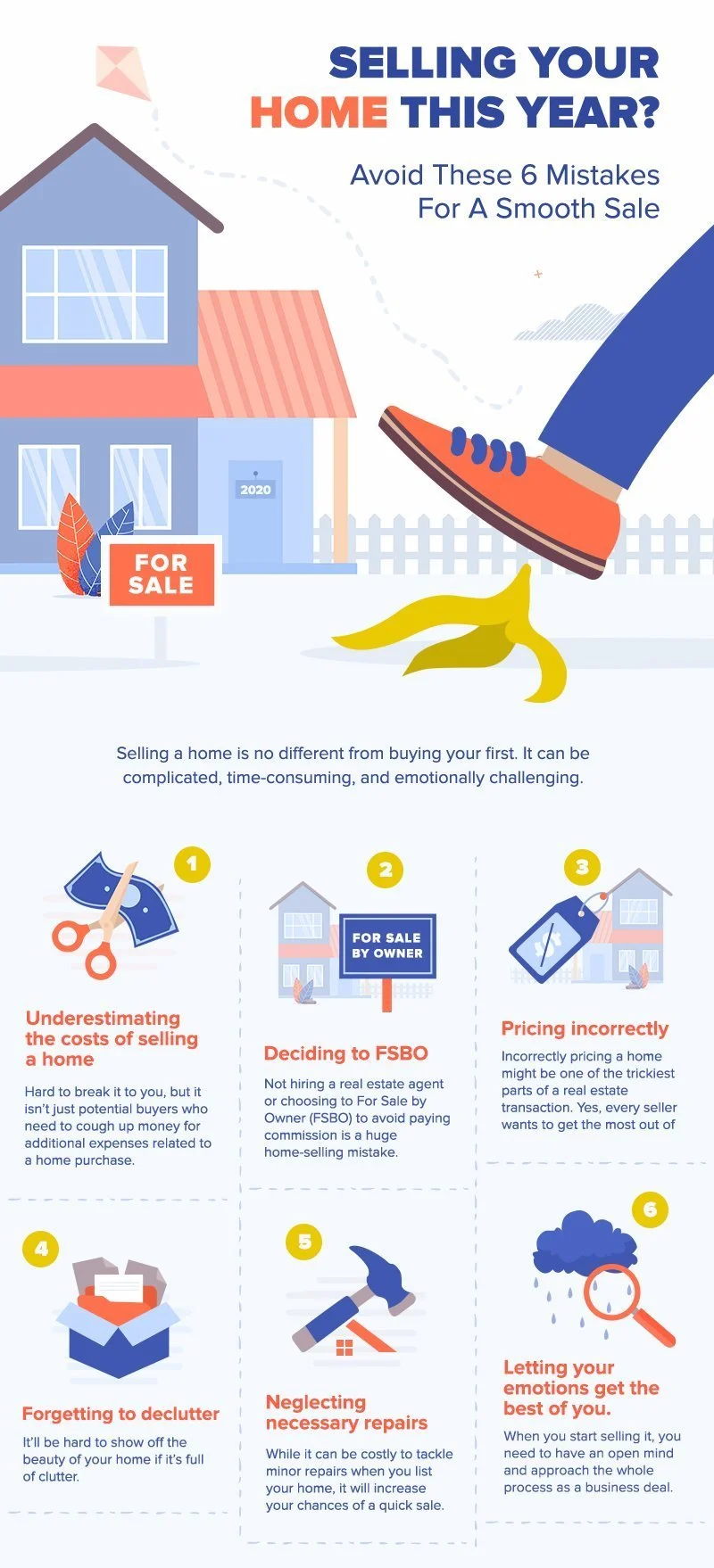 Not hiring a real estate agent or choosing to For Sale by Owner (FSBO) to avoid paying commission is a huge home-selling mistake. According to the National Association of Realtors’ 2019 Profile of Home Buyers and Sellers, only eight percent of recent home sales were FSBO, which remains at an all-time low. FSBO homes sold at a median of $200,000, compared to the median of agent-assisted homes which is at $280,000. That’s a whopping $80,000 difference!